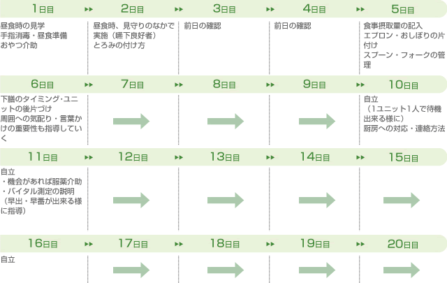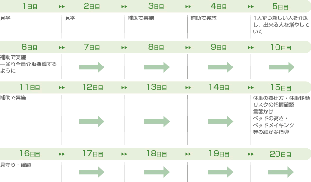 - ※1人1人の習得速度に合わせて考えていきますので上記は1例になります。教育期間後に安心して仕事をして頂ける様スタッフ全体でフォローいたします。