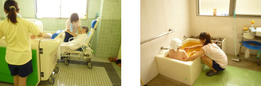 入浴のお誘い→入浴介助→入浴後の整容→食堂でのお飲み物をお出しするまでの一連の流れを1人の担当スタッフで関わらせて頂き、羞恥心に配慮した環境で、生活者様のペースを大切にした入浴タイムを過して頂いています。