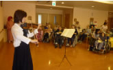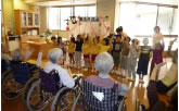 職員が仮装して、曲に合わせて歌って踊って大フィーバー!皆様で合奏も行います。職員による恒例のバイオリン演奏は、毎回拍手喝采です。 |